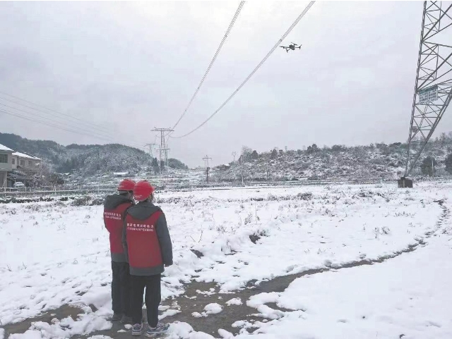 國網(wǎng)湖南電力員工開展無人機自適應巡檢,完成防凍融冰保電工作任務。國網(wǎng)湖南電力供圖