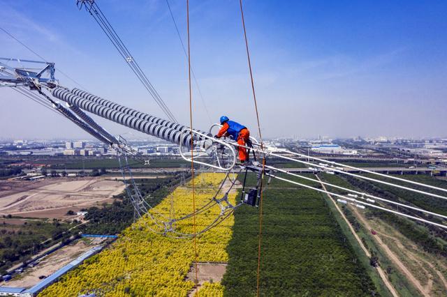 國(guó)網(wǎng)天津電力工作人員在板濱500千伏線路工程現(xiàn)場(chǎng)開(kāi)展高空走線作業(yè)。6月6日攝 國(guó)網(wǎng)天津電力供圖
