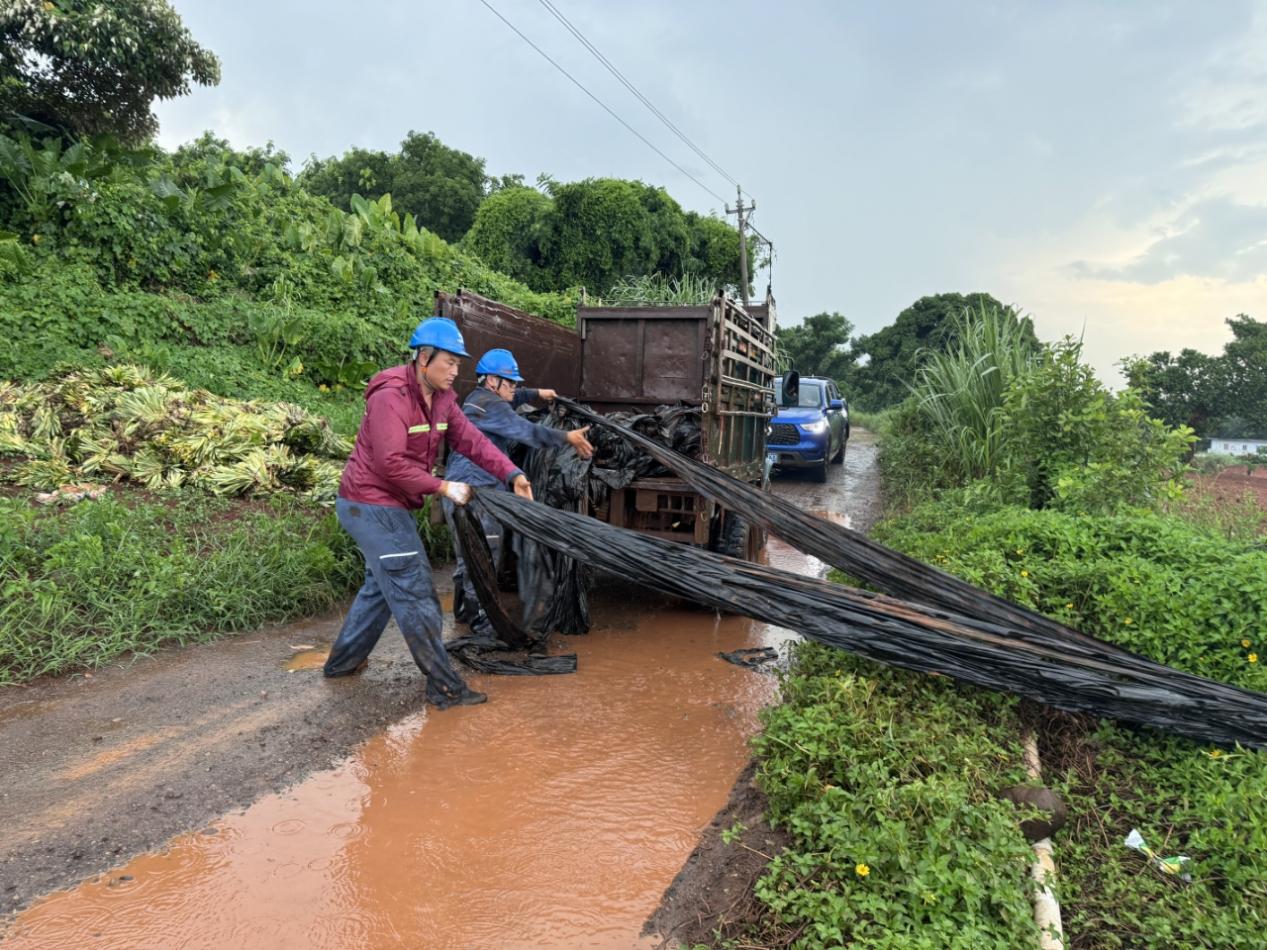 9月5日,南網(wǎng)超高壓公司海口分局員工與村民一起冒雨清理一處塑料地膜,徹底消除此處飄掛物隱患。朱陽 攝