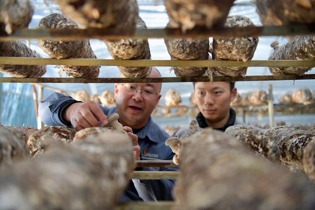 貴州安順供電局派駐安順市紫云自治縣洛麥村駐村第一書記王維鐸和農(nóng)戶在查看香菇長勢。陳娟攝