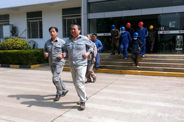11時20分,演練活動正式開始。隨著地震模擬信號(哨音)發(fā)出,辦公樓、輸煤綜合樓內(nèi)的員工立即就地躲避在三角區(qū)或內(nèi)墻角等牢固地點,用雙手保護頭部,等地震減弱后,快速、安全、有序地撤離到指定區(qū)域。
