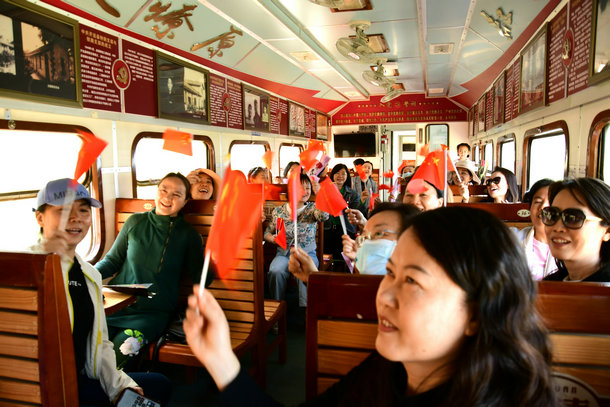 車廂內女職工們一邊欣賞沿途美景,一邊自由暢談。《黨史知識》、《女職工勞動保護特別規(guī)定》環(huán)節(jié)大家爭先恐后舉手,氣氛熱烈有趣,在搶答過程中既學習到黨史知識又增添了學習的趣味。全體人員集體合唱《我和我的祖國》,在歌聲中現(xiàn)場氣氛達到了高潮。下車后,大家來到黨建主題廣場參觀學習。