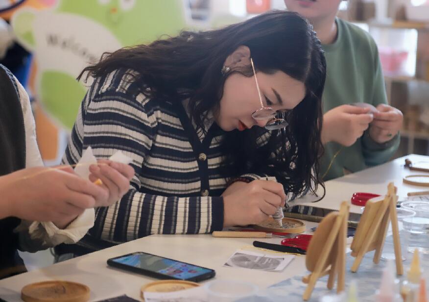 活動(dòng)中大家興致勃勃地上手在木質(zhì)杯墊上制作琺瑯畫,用細(xì)膩柔軟的金絲,貼在裝飾圖紋上,通過配色、填沙等步驟,逐步制作出一件件別具一格、匠心獨(dú)制的藝術(shù)作品,大家興趣盎然,彼此交流,共同分享動(dòng)手制作的體會(huì)和收獲的喜悅,共品非遺藝術(shù)魅力。掐絲琺瑯工藝是一種傳統(tǒng)的中國手工藝,用金屬細(xì)絲掐出圖案后填充各種顏色的琺瑯彩料,經(jīng)過多道工序,制成精美器物。本次體驗(yàn)活動(dòng)進(jìn)行掐絲琺瑯手工杯墊制作,作品可以永久保存,永不褪色,并具有很好的觀賞性和收藏價(jià)值。