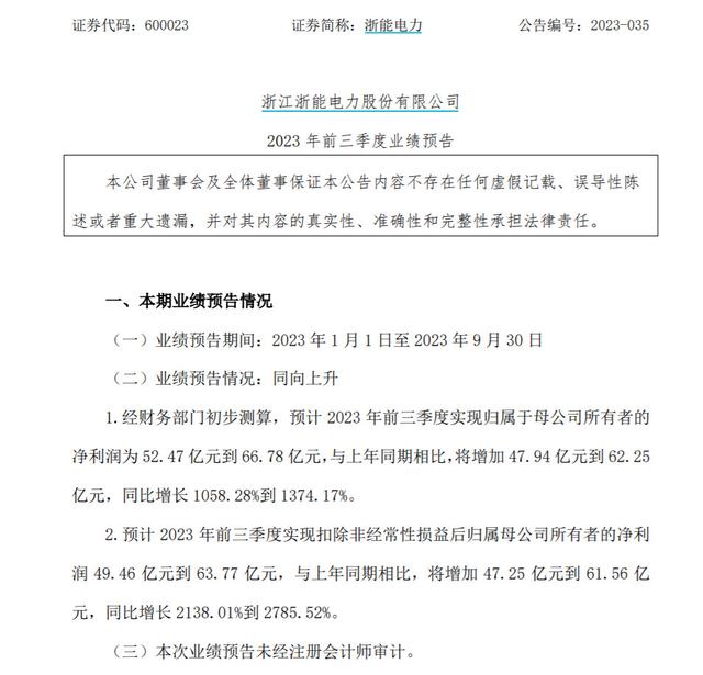 浙能電力稱,經(jīng)財(cái)務(wù)部門初步測(cè)算,預(yù)計(jì)2023年前三季度實(shí)現(xiàn)歸屬于母公司所有者的凈利潤(rùn)為52.47億元到66.78億元,與上年同期相比,將增加47.94億元到62.25億元,同比增長(zhǎng)1058.28%到1374.17%。預(yù)計(jì)2023年前三季度實(shí)現(xiàn)扣除非經(jīng)常性損益后歸屬母公司所有者的凈利潤(rùn)49.46億元到63.77億元,與上年同期相比,將增加47.25億元到61.56億元,同比增長(zhǎng)2138.01%到2785.52%。
