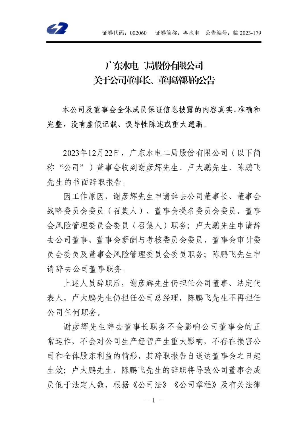 12月23日,粵水電發(fā)布公告稱(chēng),因工作原因,謝彥輝申請(qǐng)辭去公司董事長(zhǎng)、董事會(huì)戰(zhàn)略委員會(huì)委員(召集人)、董事會(huì)提名委員會(huì)委員、董事會(huì)風(fēng)險(xiǎn)管理委員會(huì)委員(召集人)職務(wù);盧大鵬申請(qǐng)辭去公司董事、董事會(huì)薪酬與考核委員會(huì)委員、董事會(huì)審計(jì)委員會(huì)委員及董事會(huì)風(fēng)險(xiǎn)管理委員會(huì)委員職務(wù);陳鵬飛申請(qǐng)辭去公司董事職務(wù)。