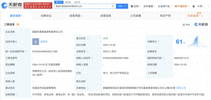 據(jù)天眼查顯示,國能托里新能源有限責任公司于近日成立,注冊資本200萬元,經(jīng)營范圍為發(fā)電業(yè)務(wù)、輸電業(yè)務(wù)、供(配)電業(yè)務(wù)。該公司由國家能源集團新疆能源有限責任公司全資持股,后者為國家能源投資集團有限責任公司全資子公司。