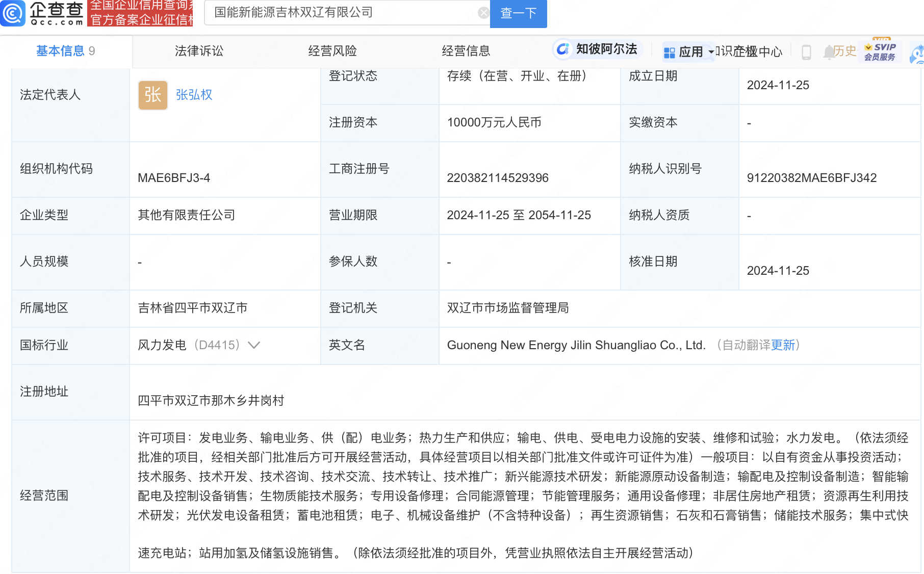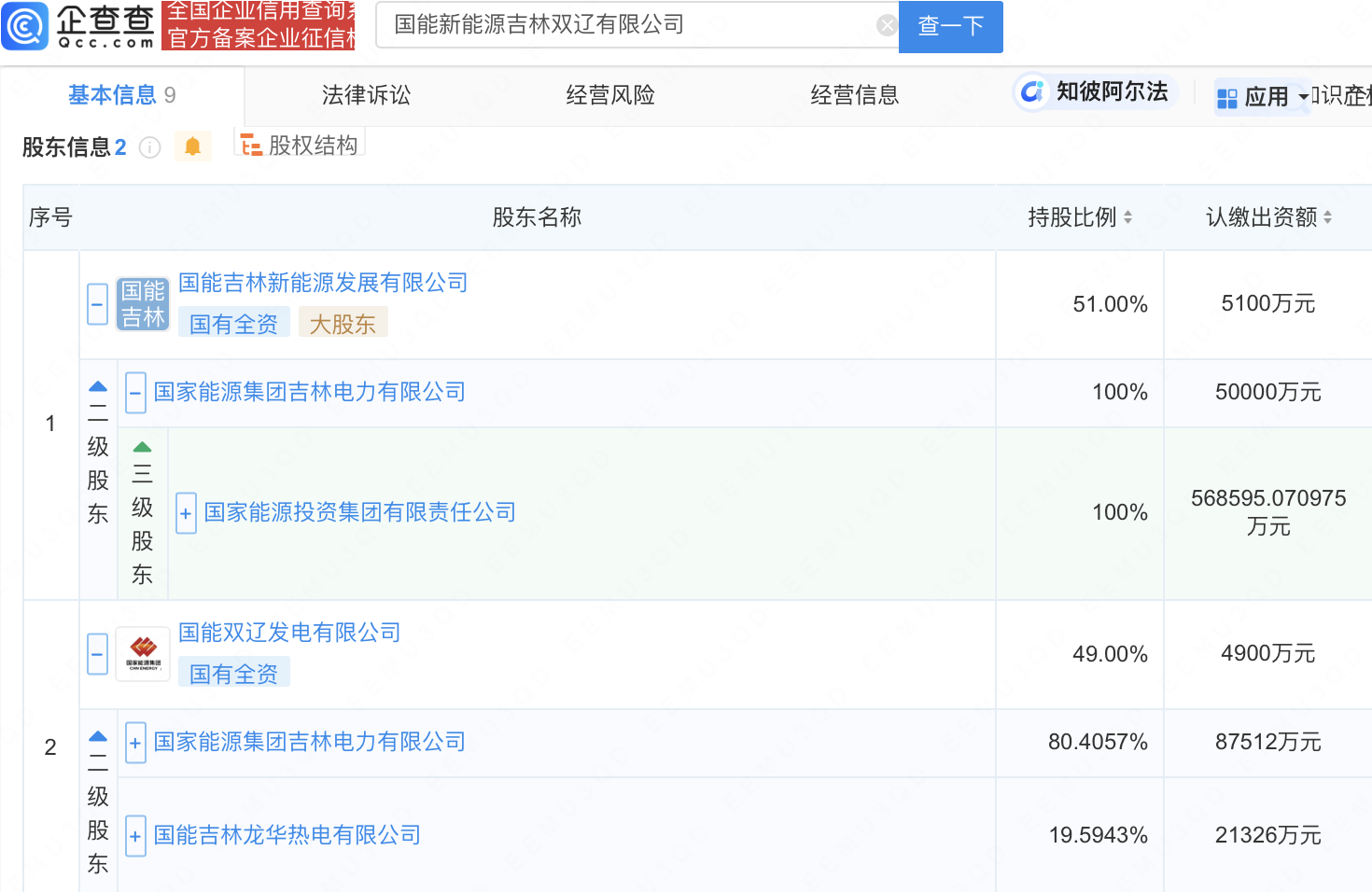 近日,國能新能源吉林雙遼有限公司成立,法定代表人為張弘權(quán),注冊資本1億人民幣,經(jīng)營范圍含新興能源技術(shù)研發(fā)、新能源原動(dòng)設(shè)備制造、生物質(zhì)能技術(shù)服務(wù)等。企查查股權(quán)穿透顯示,該公司由國家能源投資集團(tuán)有限責(zé)任公司旗下國能吉林新能源發(fā)展有限公司、國能雙遼發(fā)電有限公司共同持股。