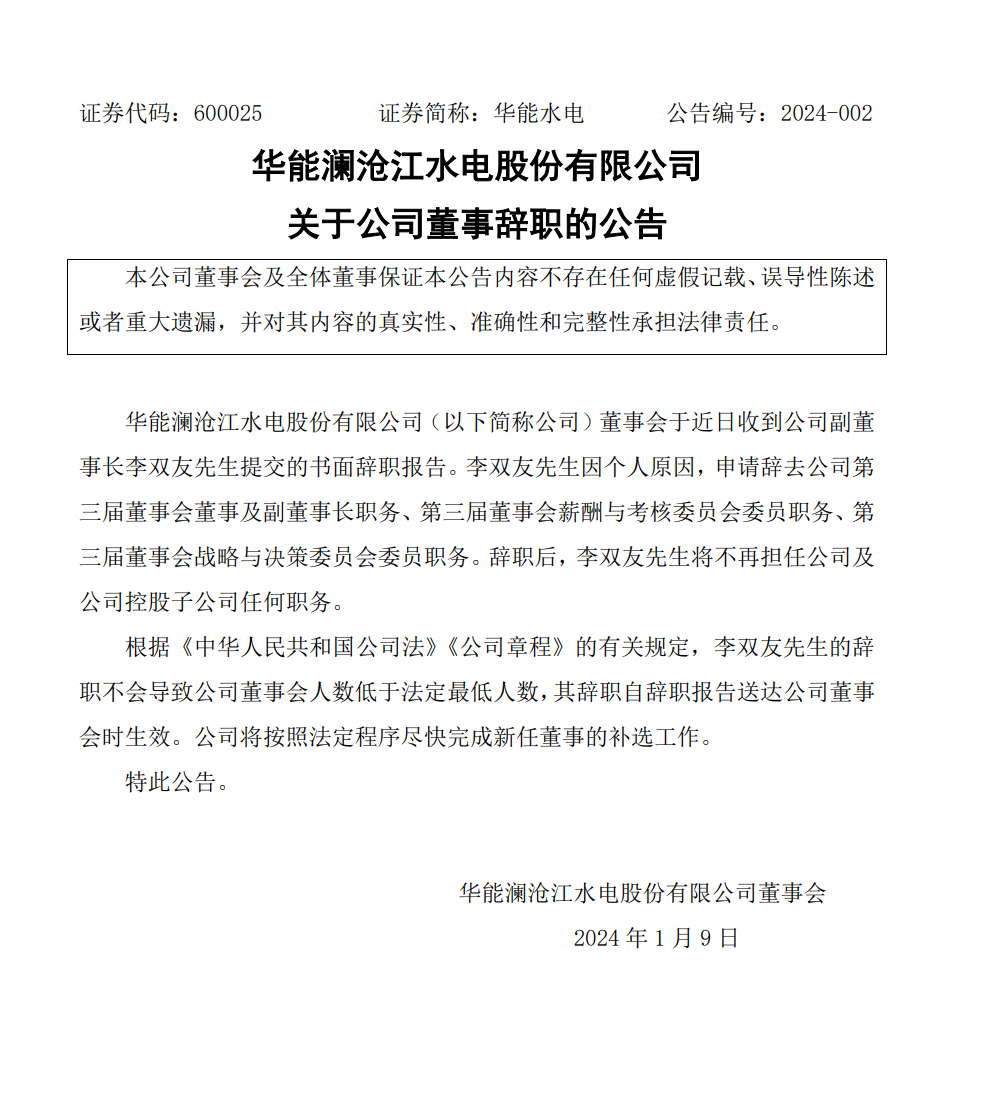 1月9日,華能水電發(fā)布公告稱,公司董事會(huì)于近日收到公司副董事長(zhǎng)李雙友先生提交的書面辭職報(bào)告。李雙友先生因個(gè)人原因,申請(qǐng)辭去公司第三屆董事會(huì)董事及副董事長(zhǎng)職務(wù)、第三屆董事會(huì)薪酬與考核委員會(huì)委員職務(wù)、第三屆董事會(huì)戰(zhàn)略與決策委員會(huì)委員職務(wù)。辭職后,李雙友先生將不再擔(dān)任公司及公司控股子公司任何職務(wù)。