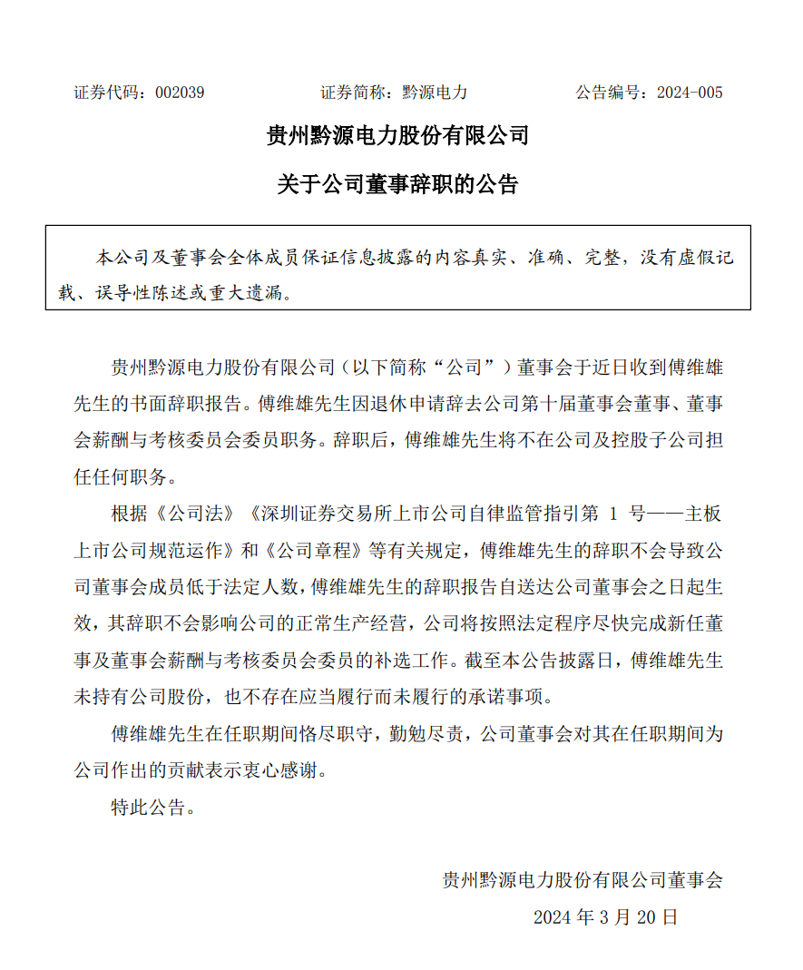 3月20日,黔源電力發(fā)布公告稱,公司董事會(huì)于近日收到傅維雄先生的書面辭職報(bào)告。傅維雄先生因退休申請(qǐng)辭去公司第十屆董事會(huì)董事、董事會(huì)薪酬與考核委員會(huì)委員職務(wù)。辭職后,傅維雄先生將不在公司及控股子公司擔(dān)任任何職務(wù)。