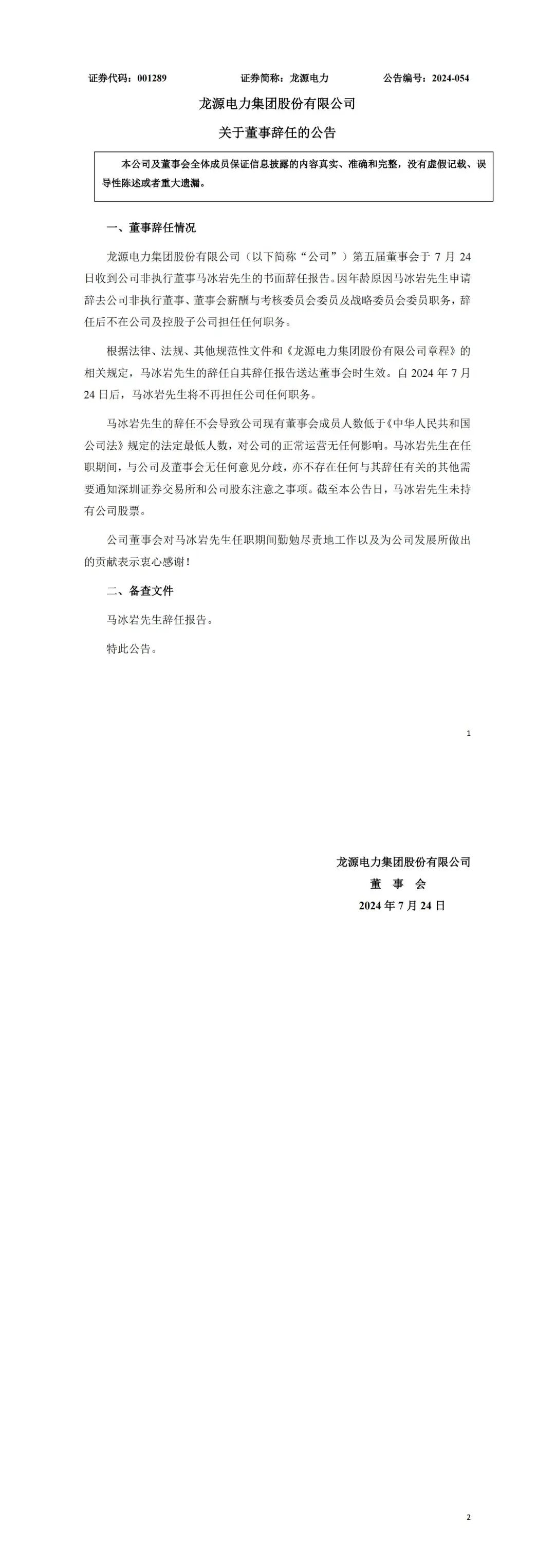 龍?jiān)措娏瘓F(tuán)股份有限公司發(fā)布公告稱(chēng),第五屆董事會(huì)于7月24日收到公司非執(zhí)行董事馬冰巖先生的書(shū)面辭任報(bào)告。因年齡原因馬冰巖先生申請(qǐng)辭去公司非執(zhí)行董事、董事會(huì)薪酬與考核委員會(huì)委員及戰(zhàn)略委員會(huì)委員職務(wù),辭任后不在公司及控股子公司擔(dān)任任何職務(wù)。