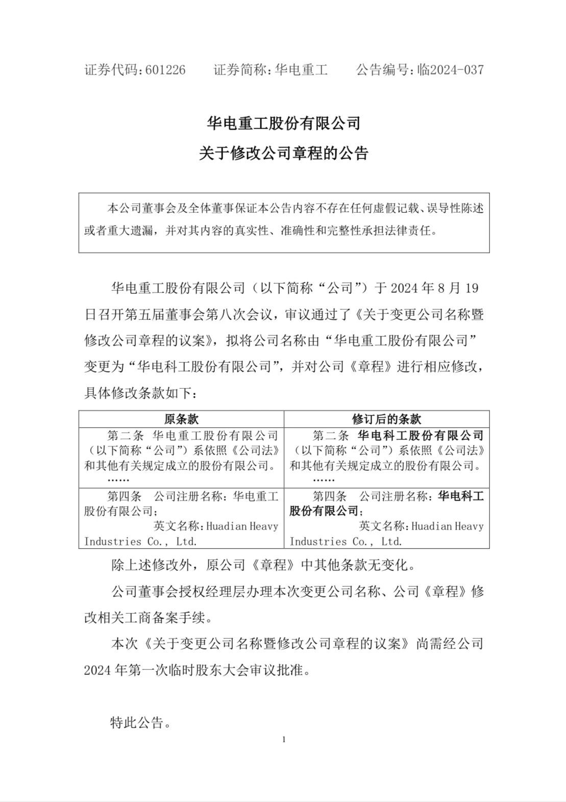 8月20日,華電重工發(fā)布公告稱,公司于2024年8月19日召開第五屆董事會第八次會議,以9票同意、0票反對、0票棄權的結果,審議通過了《關于變更公司名稱暨修改公司章程的議案》, 擬將公司中文全稱由“華電重工股份有限公司”變更為“華電科工股 份有限公司”,英文全稱保持不變。