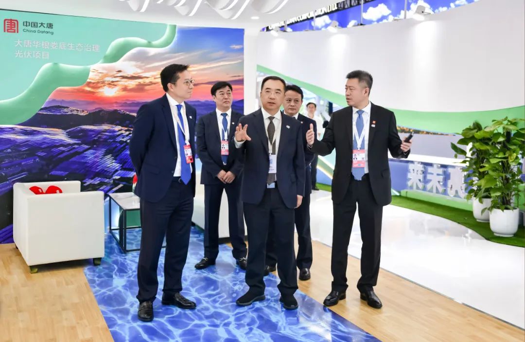 開幕式后,鄒磊、彭勇一行到中國(guó)大唐展廳和與中國(guó)大唐有深度合作關(guān)系的特電變工、隆基展區(qū)參觀。