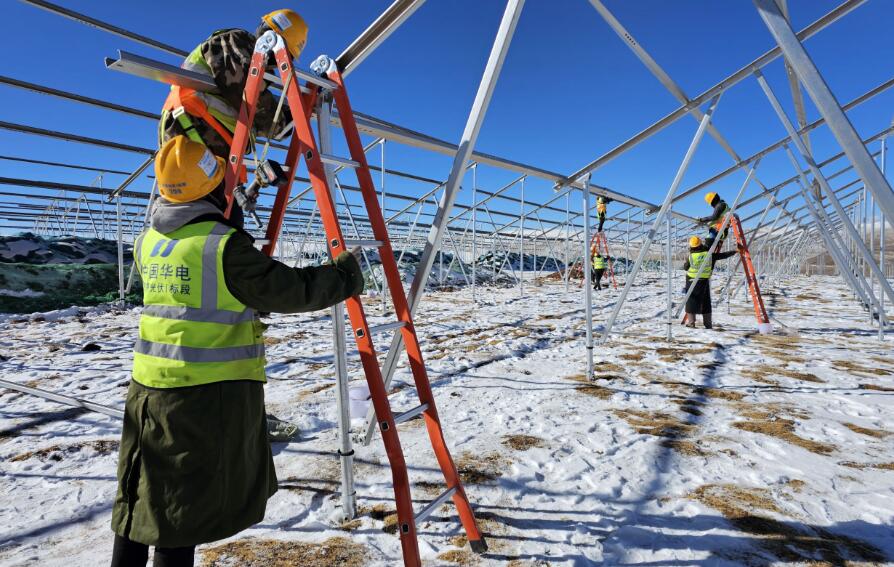 中國華電昂多180萬千瓦光伏海拔高達4200-4800米,進入冬季施工以來,工地現(xiàn)場最低溫度低至零下18度。華電昌都新能源公司為現(xiàn)場職工采購防寒保暖衣物、發(fā)放愛心藥箱、配備便攜式制氧機等,組織開展冰凍災(zāi)害應(yīng)急演練,有效提升施工人員極寒天氣安全防范意識,為冬季施工保駕護航。