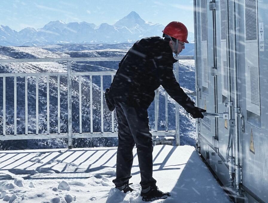地處四川甘孜州海拔4500米高原上的雅江紅星光伏項目現(xiàn)場,運維人員正踩著厚厚的積雪,在對發(fā)電設(shè)備進行仔細檢查。