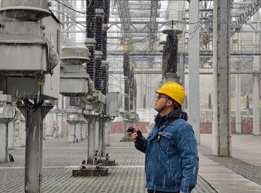 暴雪突至,浙江烏溪江公司運行人員在湖南鎮(zhèn)電站220KV開關(guān)站加強室外巡檢。