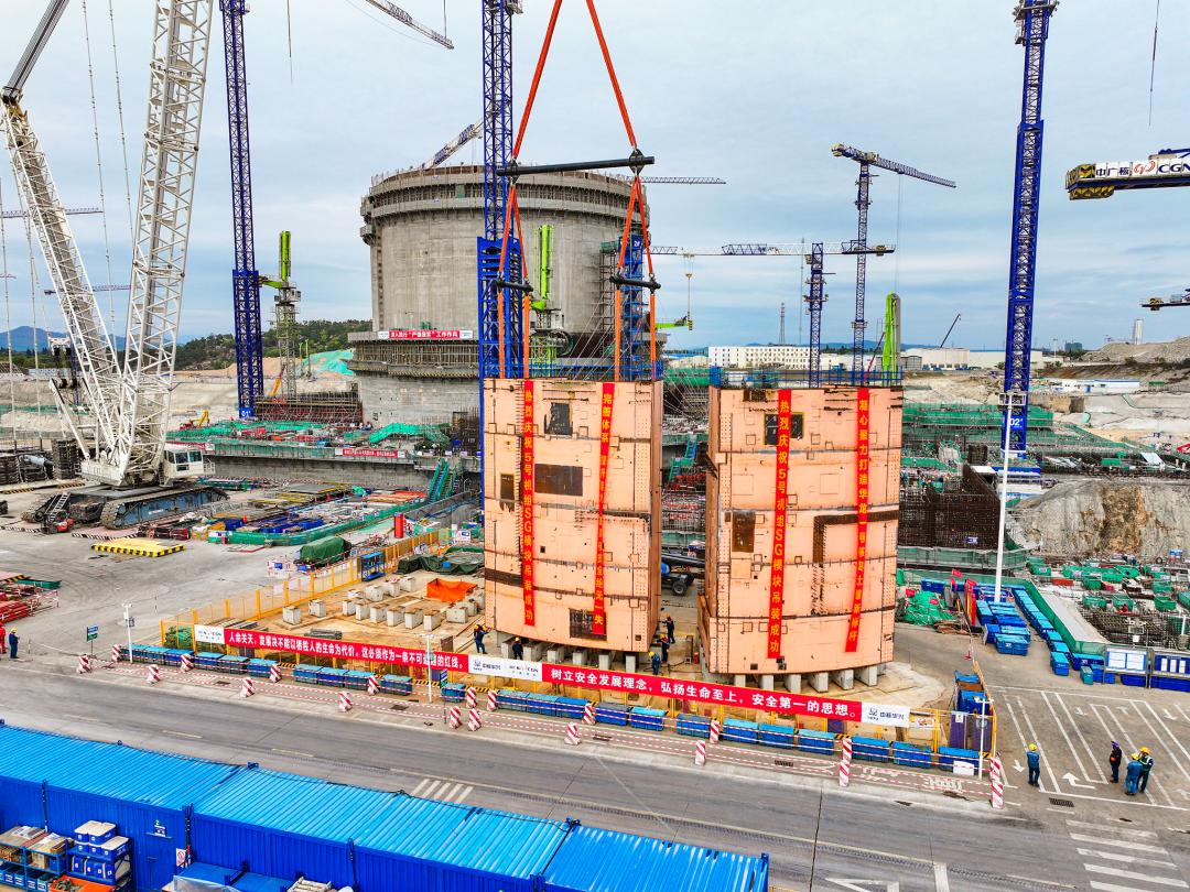 在我國長三角地區(qū)首個“華龍一號”核電項目——中廣核浙江三澳核電站,1號機組已全面轉入設備安裝階段,主設備蒸汽發(fā)生器穩(wěn)壓器、壓力容器已引入就位,核島及常規(guī)島安裝工作有序推進。2號機組進入設備安裝階段,目前環(huán)吊具備可用條件,反應堆廠房內(nèi)穹頂施工中,外殼施工至第10層,周邊廠房平衡推進中。