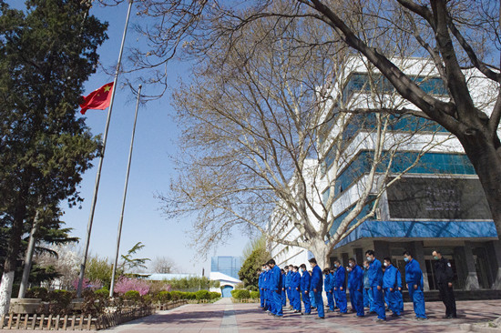 上午9時(shí)50分,來(lái)自各個(gè)崗位的30余名干部職工紛紛停下了手中的工作,集結(jié)一起,面向國(guó)旗整齊列隊(duì)。10時(shí),防空警報(bào)鳴響,職工們懷著萬(wàn)分悲痛的心情默哀三分鐘。