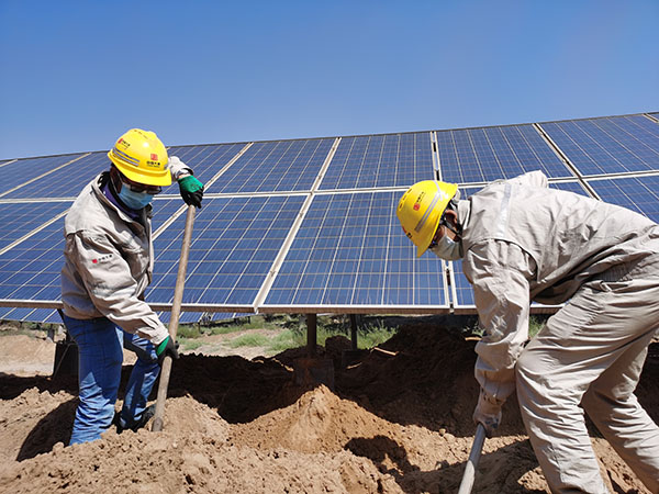 該光伏電站地處內(nèi)蒙古阿拉善烏蘭布和沙漠邊緣,現(xiàn)場(chǎng)土質(zhì)多為粉細(xì)砂,堅(jiān)土層較薄,不利于光伏站內(nèi)箱式變壓器、逆變器、匯流箱及光伏組串等設(shè) 備基礎(chǔ)穩(wěn)固,特別在雨季時(shí)期,雨水對(duì)光伏組件基礎(chǔ)沖刷影響較大。該公司運(yùn)維人員及時(shí)開展光伏組件基礎(chǔ)土方回填工作,現(xiàn)場(chǎng)采用機(jī)械填土和人工補(bǔ)填方式進(jìn)行,一邊裝載車和挖掘機(jī)配合,將土方填至光伏板背光面,另一邊人工回填光伏板正下方區(qū)域。在控制土方高度時(shí),運(yùn)維人員嚴(yán)格按照規(guī)范要求,夯實(shí)并填平土方,保證光伏方陣組件最下端與地面距離不低于0.3米,確保光伏板受光良好。在控制加固工期期間,該公司運(yùn)維人員早出晚歸、雷厲風(fēng)行,歷時(shí)兩天,順利完成任務(wù)區(qū)的基礎(chǔ)加固工作。