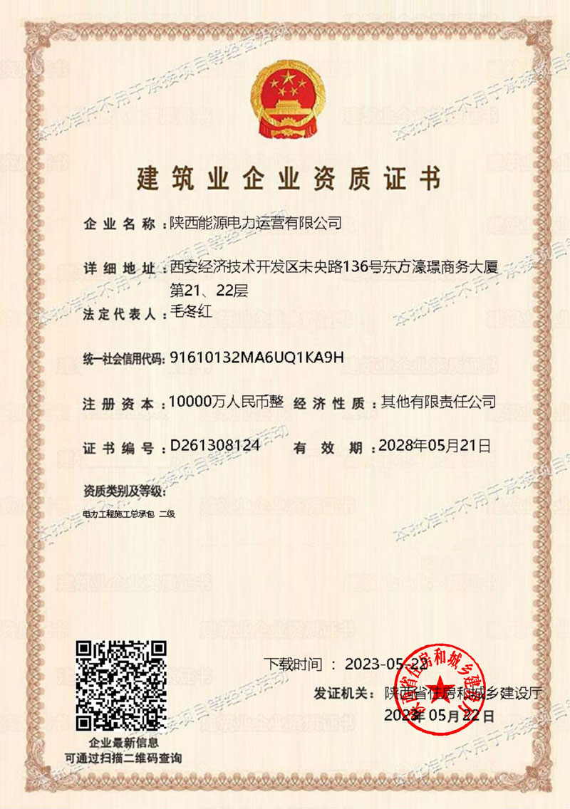 陜投電力運(yùn)營(yíng)順利取得電力工程施工總承包二級(jí)資質(zhì)