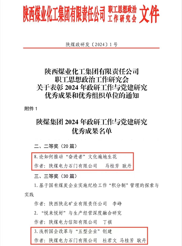 陜煤石電2項政研成果獲集團(tuán)公司表彰