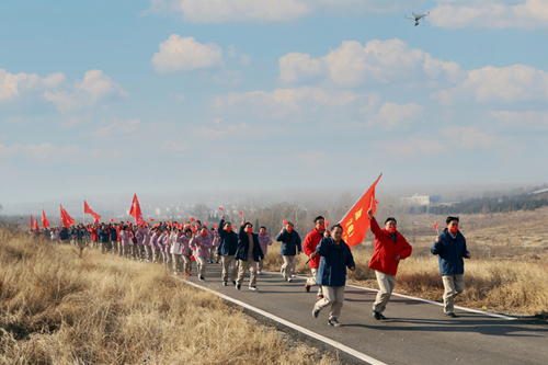 徒步隊(duì)伍精神飽滿、興致高昂、闊步向前,走出廠門后從虎山腳下沿黃營(yíng)村棗林觀光道向上前行。途經(jīng)之處生態(tài)風(fēng)景獨(dú)特、空氣凌冽清澈,全體人員邁著矯健的步伐、排著整齊的隊(duì)伍、揮舞著鮮艷的國(guó)旗,激情迸發(fā)、活力四射,徒步完成近7公里的路程,在碧空湛藍(lán)、冬陽(yáng)高照的風(fēng)景里,描繪了一幅幅團(tuán)結(jié)一心、眾志成城的拼搏畫面。