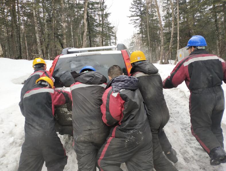 見此情形,大家拿出鐵鍬沿著車輪行駛的方向將積雪清理干凈,幾經(jīng)周折,車終于從泥濘中開了出來。