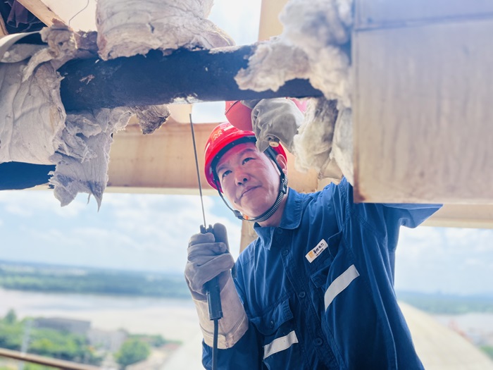 在南熱廠區(qū),老員工湯勝寶正帶領著他的工作小組,為鋪排管道做準備工作,他還有不到一年的時間就要退休,但他仍然老當益壯,在室外43度以上的烈日下,肩扛手抬著一根根鋼管。幾根鋼管抬放就位后,他累得滿臉是汗,氣喘吁吁,但他性格要強,不服老,依然說著:沒事,這點活算不了什么。