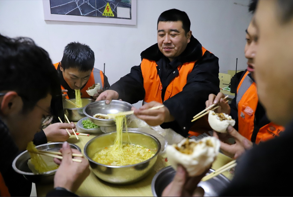 檢車員們列著整齊的隊(duì)伍滿心歡喜地奔向待檢室,圍坐在臨時(shí)飯桌旁,他們那一雙雙因長時(shí)間戶外作業(yè)而黝黑、僵硬的手,與桌上潔白的筷子形成鮮明對比。餐桌上的面條、饅頭和加熱的菜肴雖簡單,卻在寒夜中散發(fā)著溫暖。