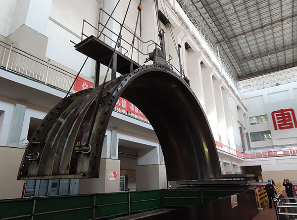該公司密切關(guān)注本次轉(zhuǎn)輪室吊裝作業(yè),2號(hào)機(jī)組轉(zhuǎn)輪室上半部重約16噸,為確保本次吊裝工作的順利進(jìn)行,該公司根據(jù)現(xiàn)場情況,對(duì)參與本次吊裝工作的全體人員進(jìn)行安全技術(shù)交底,所有工作人員清楚工作內(nèi)容、方法和要求。同時(shí)監(jiān)督吊裝作業(yè)各項(xiàng)措施全部落實(shí)到位,明確各項(xiàng)責(zé)任。在吊裝過程中,工作負(fù)責(zé)人和橋機(jī)指揮人員密切關(guān)注轉(zhuǎn)輪室擺動(dòng)幅度,及時(shí)進(jìn)行方位調(diào)整,各部位設(shè)專人負(fù)責(zé),各環(huán)節(jié)做到無縫銜接,最終圓滿完成了2號(hào)機(jī)組轉(zhuǎn)輪室上半部吊裝工作。