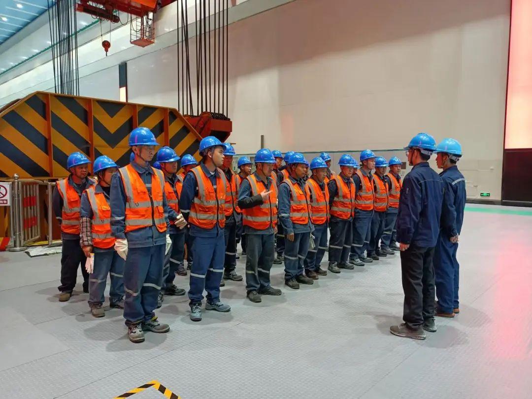 事關(guān)安全生產(chǎn),反復(fù)強(qiáng)調(diào)再多次都不為過(guò)!當(dāng)天上午08:55,當(dāng)參與吊出作業(yè)的人員陸續(xù)到齊后,總指揮陳宇現(xiàn)場(chǎng)主持召開了起吊啟動(dòng)會(huì),再次明確各單位職責(zé)分工,并組織參吊人員認(rèn)真進(jìn)行安全技術(shù)交底,希望全體人員凝心聚力、振奮精神,確保本次轉(zhuǎn)子吊出工作安全有序完成。