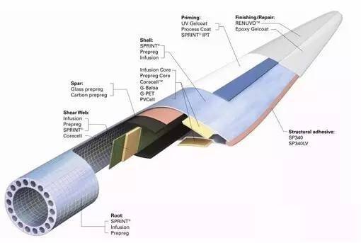 預(yù)浸料是生產(chǎn)復(fù)雜形狀結(jié)構(gòu)件的理想工藝,預(yù)浸料在國(guó)外運(yùn)用非常廣泛,其工藝及設(shè)備也發(fā)展到成熟階段。實(shí)際生產(chǎn)中,由于葉片的蒙皮、主梁、根部等各個(gè)部位的力學(xué)性能及工藝的要求各不相同,因而,在不影響性能的條件下,為了降低成本,不同部分使用不同的預(yù)浸料。
