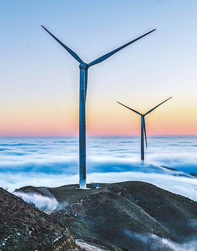 圖為近日拍攝的湖南省常寧市風(fēng)電設(shè)備。