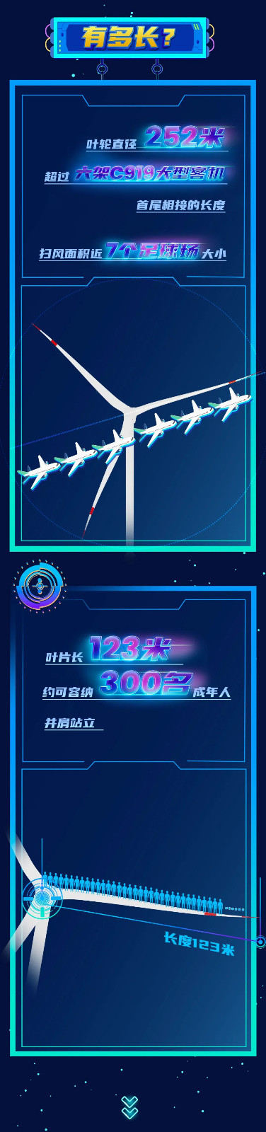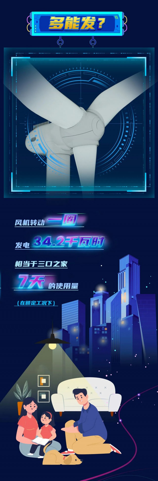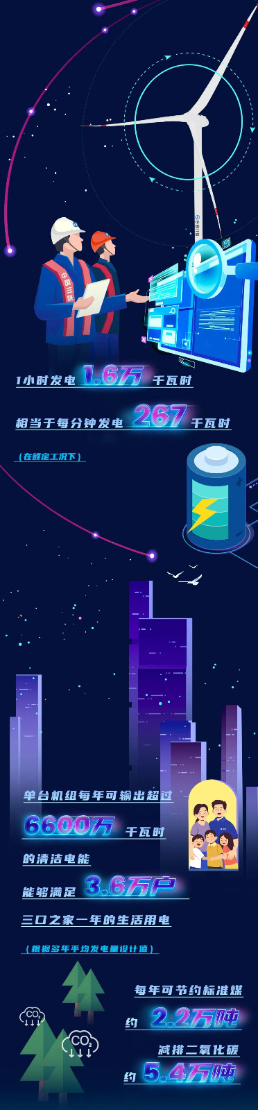 此次下線的單機容量16兆瓦海上風電機組,葉輪直徑252米,葉輪掃風面積約5萬平方米,約相當于7個標準足球場大;輪轂高度達146米,約相當于一座50層大樓的高度。在額定工況下,單臺機組每轉動一圈可發(fā)電34.2千瓦時。根據(jù)多年平均發(fā)電量設計值,單臺機組每年可輸出超過6600萬千瓦時的清潔電能,能夠滿足3.6萬戶三口之家一年的生活用電,可節(jié)約標煤約2.2萬噸,減排二氧化碳約5.4萬噸。