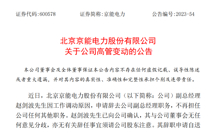 公告披露,近日,京能電力副總經理趙劍波先生因工作調動原因,申請辭去公司副總經理職務,不再擔任公司任何其他職務。趙劍波先生已向公司確認,其與公司董事會無任何意見分歧,亦無有關辭任事宜須請公司股東注意。其辭職申請自送達公司董事會時生效。本次人事變動不會影響公司相關工作的正常開展。