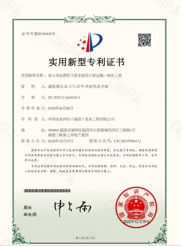 近日,由中國水電四局福清公司申報(bào)的實(shí)用新型專利《海上風(fēng)電塔筒下段支墊用立樁運(yùn)輸一體化工裝》順利通過國家知識產(chǎn)權(quán)局審查并獲得授權(quán)。截至目前,福清公司共獲得實(shí)用新型專利授權(quán)25項(xiàng)。
