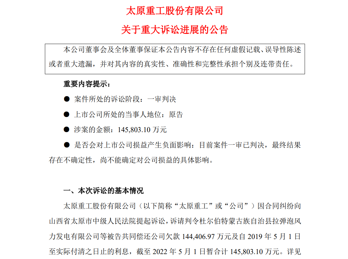公告披露,太原重工因合同糾紛向山西省太原市中級人民法院提起訴訟,訴請判令杜爾伯特蒙古族自治縣拉彈泡風(fēng)力發(fā)電有限公司(以下簡稱“拉彈泡公司”)等被告共同償還公司欠款144,406.97萬元及自2019年5月1日至實際付清之日止的利息,截至2022年5月1日暫合計145,803.10萬元。