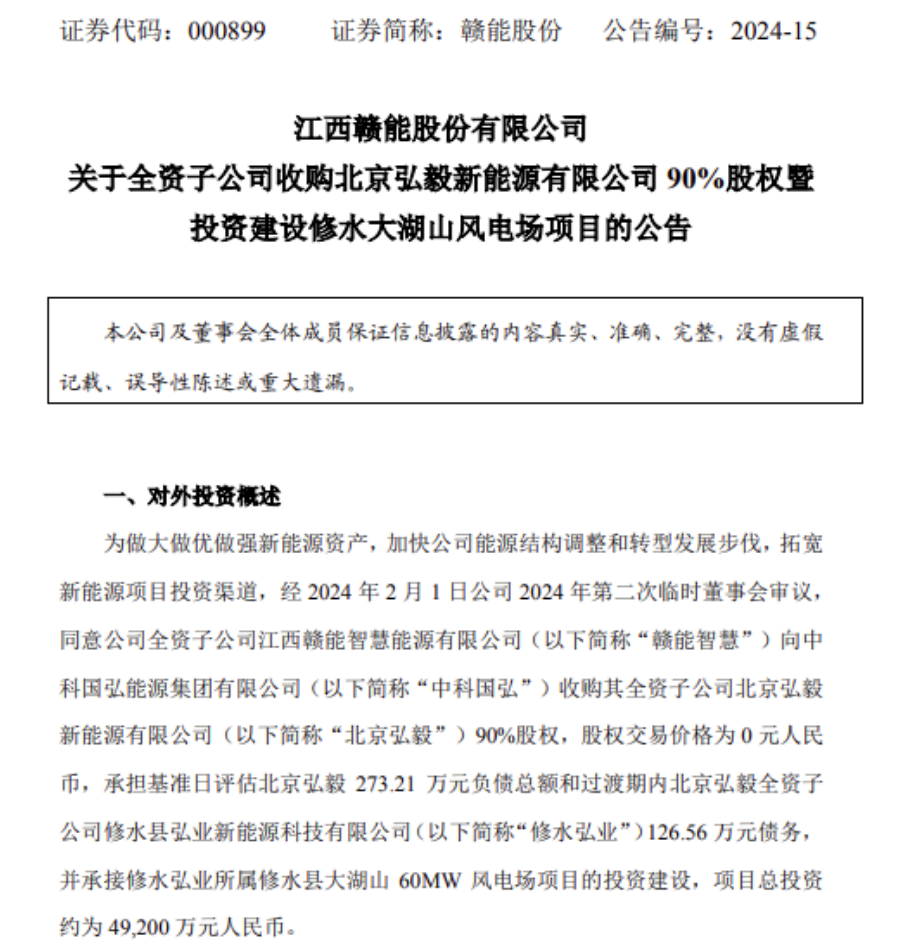 公告顯示,贛能股份全資子公司江西贛能智慧能源有限公司向中科國弘能源集團(tuán)有限公司收購其全資子公司北京弘毅新能源有限公司90%股權(quán),股權(quán)交易價(jià)格為0元人民幣,承擔(dān)基準(zhǔn)日評估北京弘毅273.21萬元負(fù)債總額和過渡期內(nèi)北京弘毅全資子公司修水縣弘業(yè)新能源科技有限公司126.56萬元債務(wù),并承接修水弘業(yè)所屬修水縣大湖山60MW風(fēng)電場項(xiàng)目的投資建設(shè),項(xiàng)目總投資約為4.92億元人民幣。