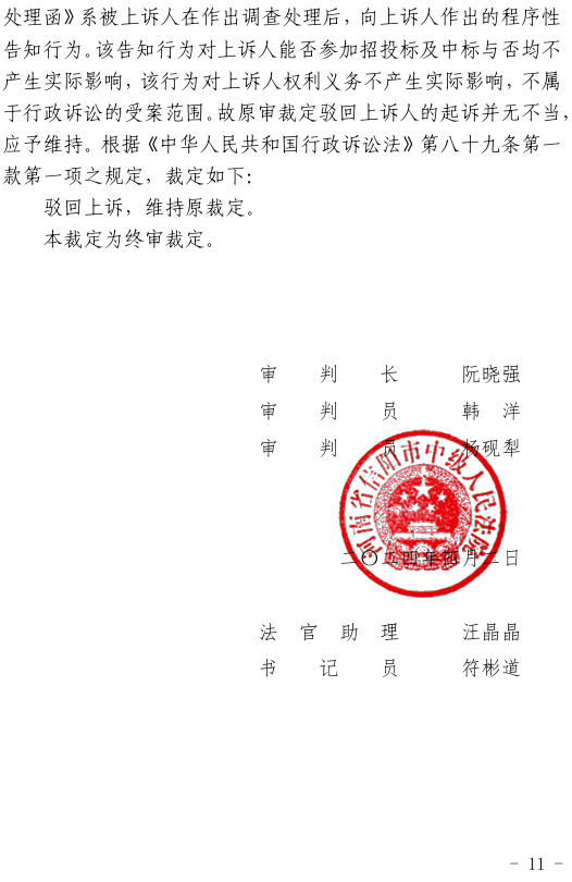 二審法院裁定的理由是:二審經(jīng)審理查明的事實(shí)與原審查明事實(shí)一致,不屬于行政訴訟的受案范圍【詳見下附一:《河南省信陽市中級(jí)人民法院行政裁定書》(共11頁)】。