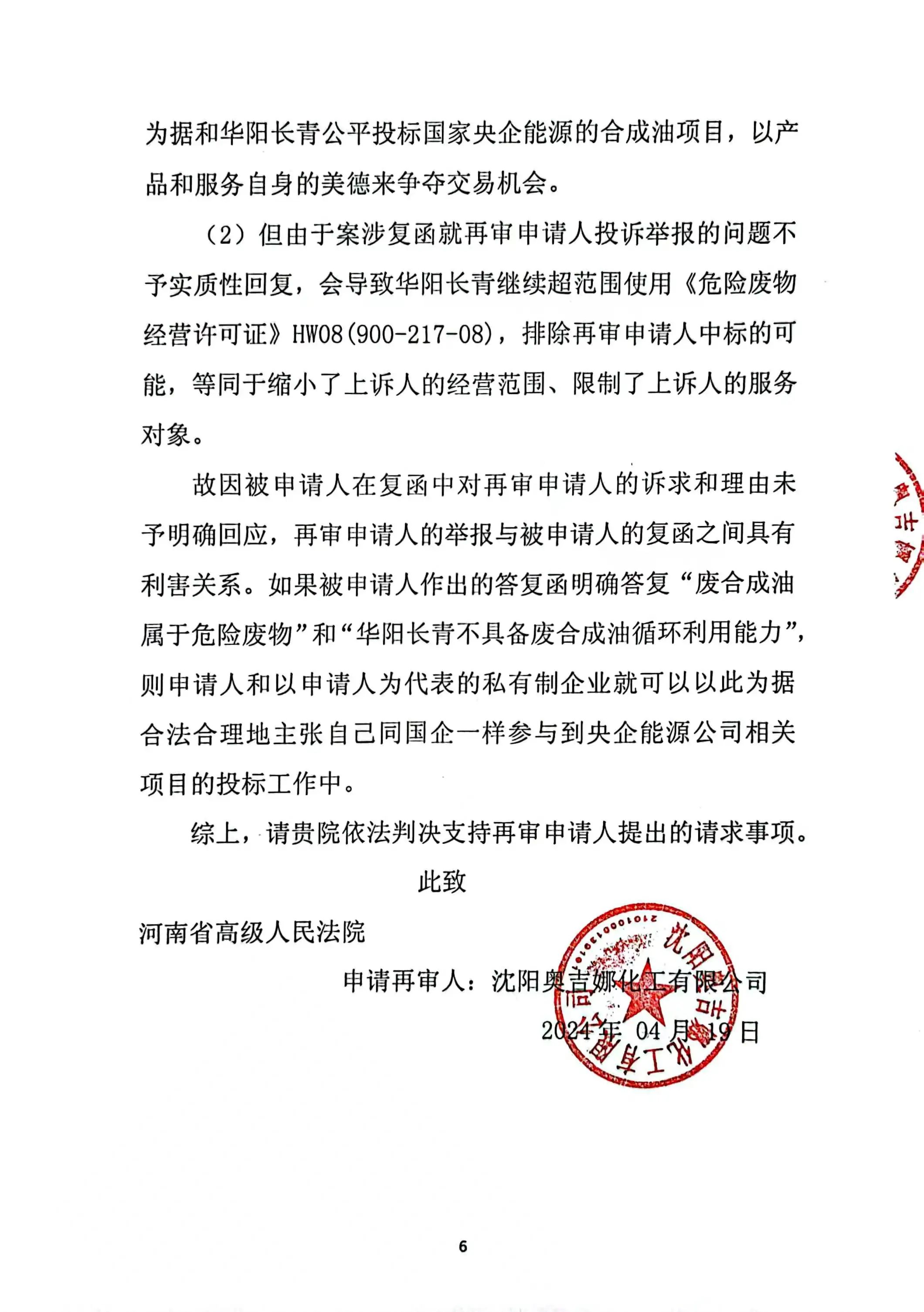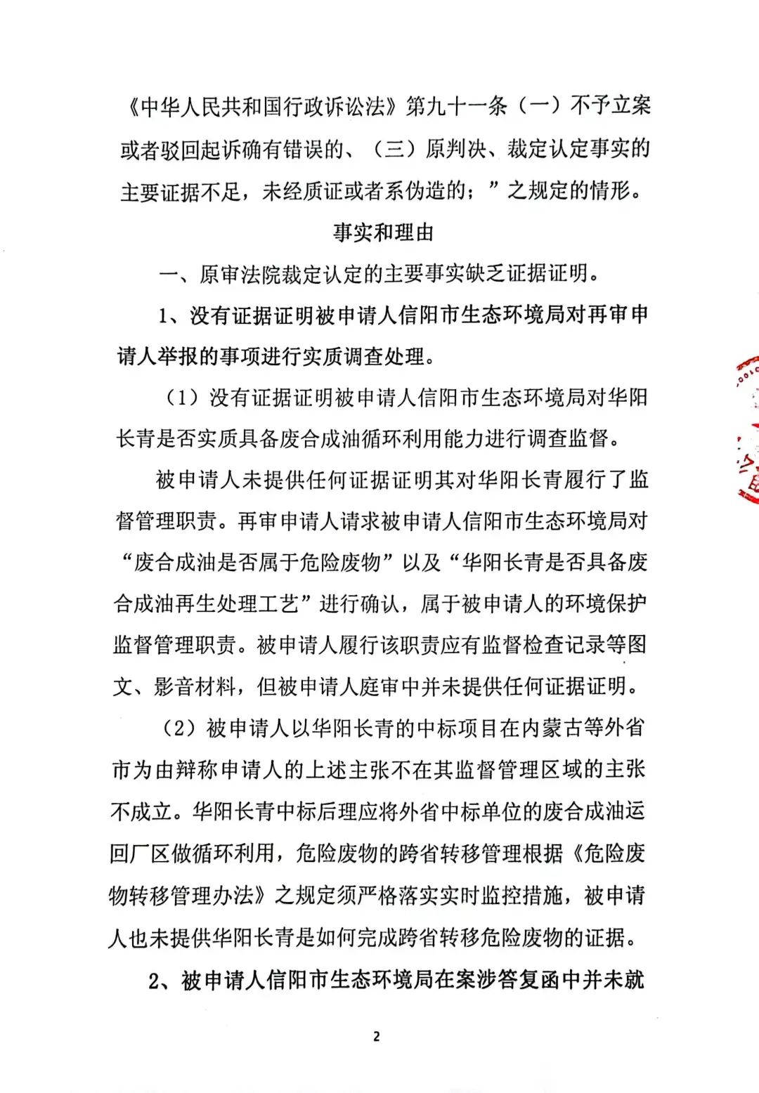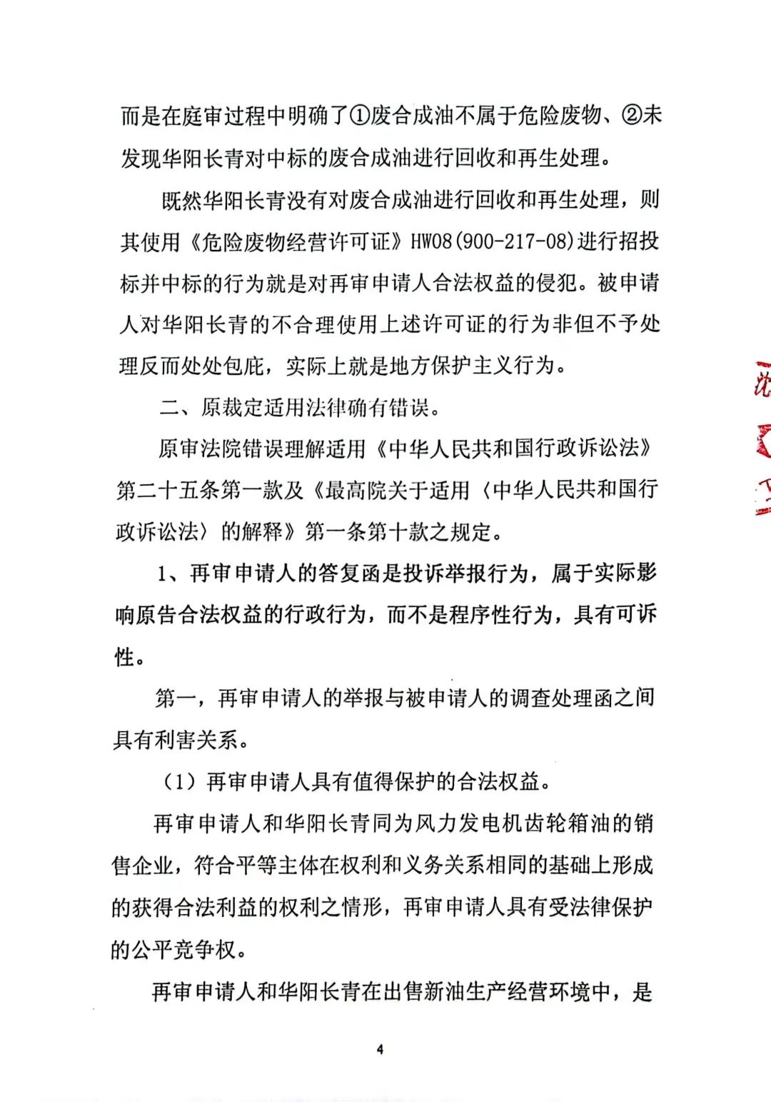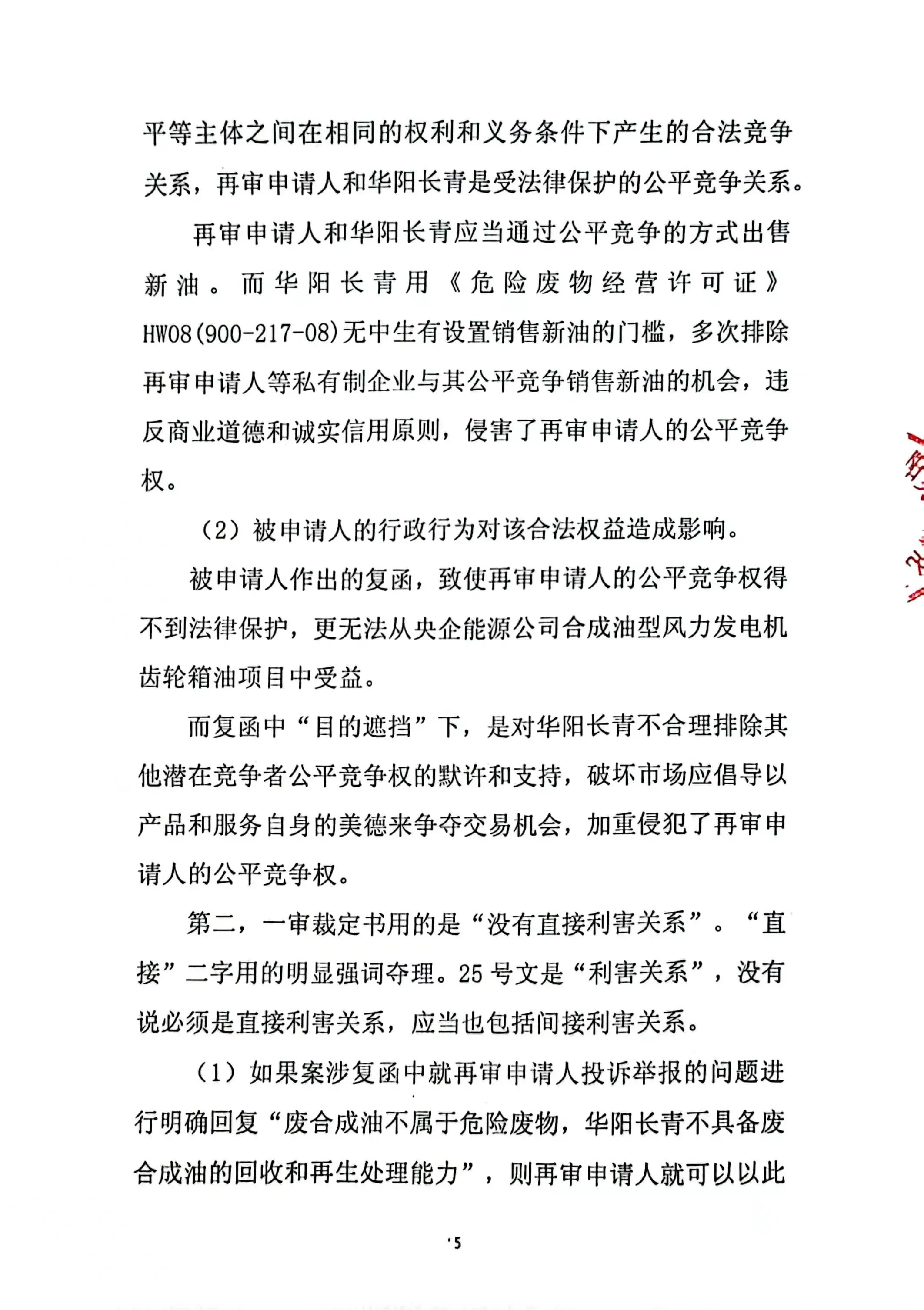 奧吉娜公司在再審申請(qǐng)中再次要求對(duì)兩個(gè)關(guān)鍵問題進(jìn)行法庭調(diào)查:1、《調(diào)查處理函》中的回答是錯(cuò)誤的。信陽市生態(tài)環(huán)境局依據(jù)《國(guó)家危險(xiǎn)廢物名錄(2021版)》認(rèn)定廢合成油不屬于危險(xiǎn)廢物,不需要《危險(xiǎn)廢物許可證》這種回答是錯(cuò)誤的,而且作為一個(gè)市級(jí)行政職能部門信陽市生態(tài)環(huán)境局也無權(quán)作出這種認(rèn)定。2、根據(jù)奧吉娜公司對(duì)目前廢合成型風(fēng)電潤(rùn)滑油再生技術(shù)的了解,華陽長(zhǎng)青公司不具備廢合成型風(fēng)電潤(rùn)滑油的再生能力,所謂的再生處理存在造假和欺騙的嫌疑!