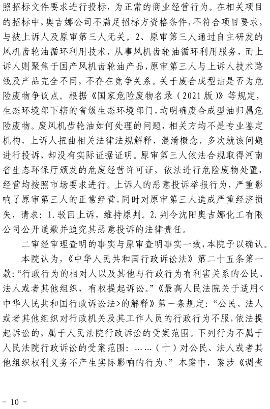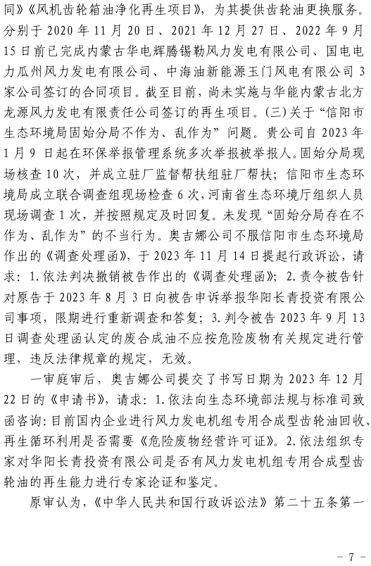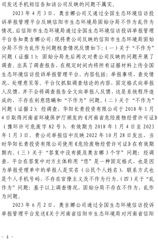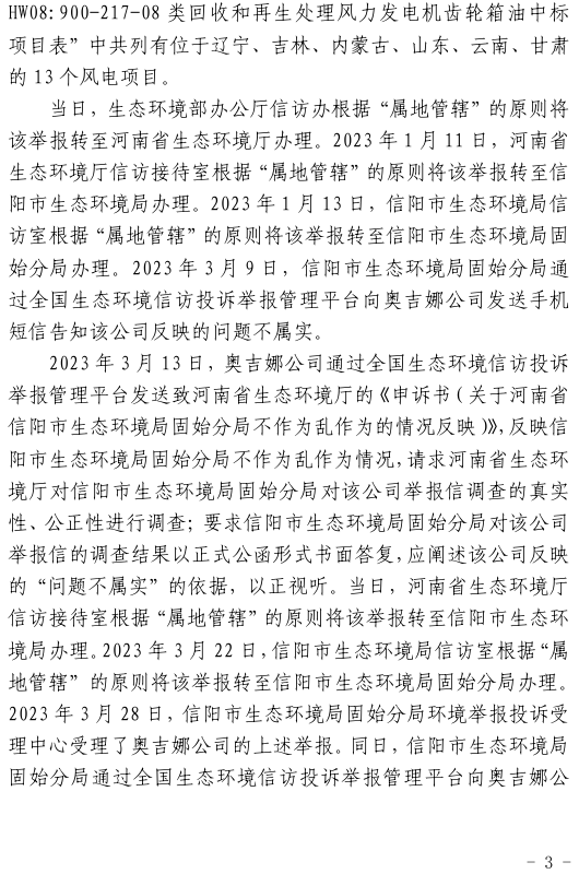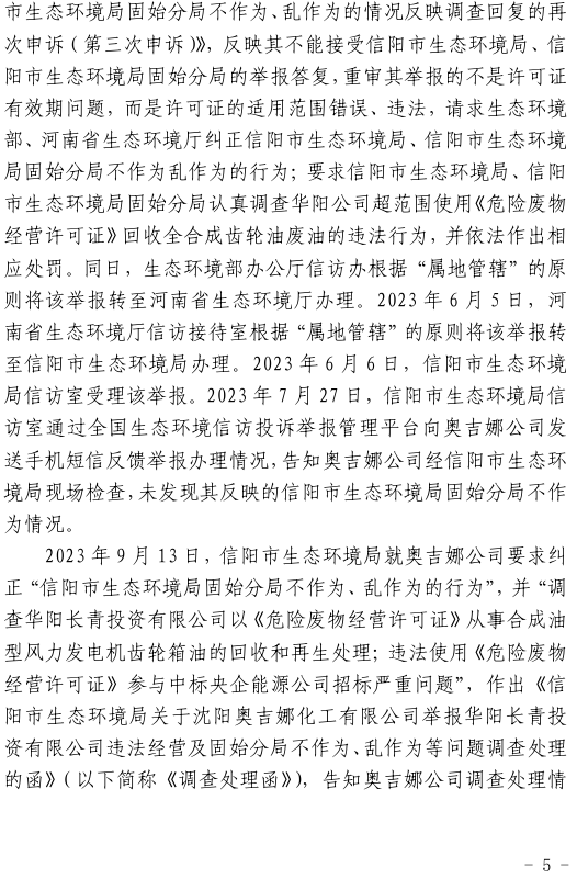 2023年3月9日,奧吉娜公司收到固始分局通過12369環(huán)境信訪平臺(tái)的短信答復(fù):“反映問題不屬實(shí)”。3月10日,奧吉娜公司向固始分局負(fù)責(zé)人電話詢問,其解釋稱:經(jīng)調(diào)查核實(shí),華陽長(zhǎng)青公司沒有再生風(fēng)電潤(rùn)滑油銷售,出售的是新油。否定了奧吉娜公司的舉報(bào)內(nèi)容。對(duì)此,奧吉娜公司表示強(qiáng)烈不滿。3月11日,奧吉娜公司向環(huán)境部投訴固始分局的不作為和亂作為。2023年5月26日,奧吉娜公司收到12369環(huán)境信訪平臺(tái)的短信答復(fù)。答復(fù)部門為信陽環(huán)境局。令人啼笑皆非的是,答復(fù)稱,華陽長(zhǎng)青的許可證有效期沒有問題,與舉報(bào)內(nèi)容風(fēng)馬牛不相及。2023年6月13日,奧吉娜公司再次向環(huán)境部提出申訴,指出,奧吉娜舉報(bào)的不是許可證有效期問題,而是許可證的適用范圍錯(cuò)誤、違法。2023年7月27日,奧吉娜公司收到回復(fù)稱,經(jīng)信陽市生態(tài)環(huán)境局現(xiàn)場(chǎng)檢查,未發(fā)現(xiàn)固始分局不作為情況。2023年8月3日,奧吉娜公司向河南省生態(tài)環(huán)境廳(以下稱:環(huán)境廳)舉報(bào)信陽環(huán)境局包庇固始分局的行為。環(huán)境廳對(duì)此高度重視,有關(guān)處長(zhǎng)和奧吉娜公司負(fù)責(zé)人進(jìn)行了面談。2023年9月13日,信陽環(huán)境局向奧吉娜公司致《信陽市生態(tài)環(huán)境局關(guān)于沈陽奧吉娜化工有限公司舉報(bào)華陽長(zhǎng)青投資有限公司違法經(jīng)營(yíng)及固始分局不作為、亂作為等問題調(diào)查處理的函》。函中:一是,以“齒輪箱”替換“齒輪箱油”,偷換概念;二是,做出了廢風(fēng)電合成(齒輪)油不屬于危險(xiǎn)廢物的結(jié)論;三是,未發(fā)現(xiàn)固始分局存在不作為、亂作為的不當(dāng)行為。再次否定奧吉娜公司的舉報(bào)和投訴。