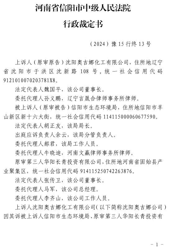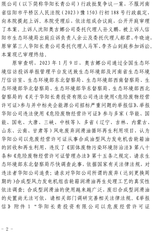 中國(guó)電力網(wǎng)訊  中國(guó)風(fēng)電潤(rùn)滑油龍頭企業(yè)沈陽奧吉娜化工有限公司(下簡(jiǎn)稱:奧吉娜公司或上訴人)訴信陽市生態(tài)環(huán)境局(被上訴人)和第三人華陽長(zhǎng)青投資有限公司(下簡(jiǎn)稱:華陽長(zhǎng)青公司)行政訴訟案,河南省信陽市中級(jí)人民法院于2024年4月2日作出二審行政裁定:駁回上訴,維護(hù)原裁定。