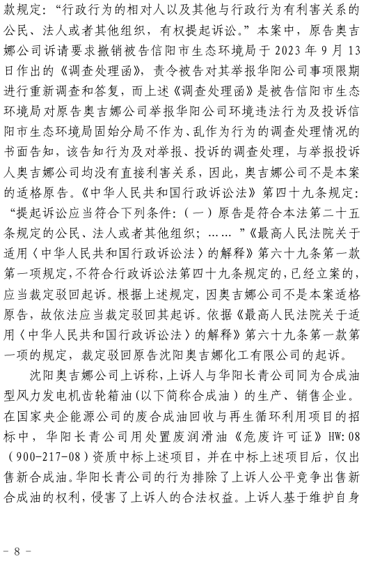 2023年10月18日,奧吉娜公司依據(jù)《行政訴訟法》和《行政訴訟法解釋》,將信陽市環(huán)境局和第三人華陽長(zhǎng)青公司訴至信陽市平橋區(qū)人民法院,請(qǐng)求法院:1、判決撤銷被告作出的《信陽市生態(tài)環(huán)境局關(guān)于沈陽奧吉娜化工有限公司舉報(bào)華陽長(zhǎng)青投資有限公司違法經(jīng)營(yíng)及固始分局不作為、亂作為等問題調(diào)查處理的函》;2、責(zé)令被告針對(duì)原告于2023年8月3日向被告申訴舉報(bào)華陽長(zhǎng)青投資有限公司事項(xiàng),限期進(jìn)行重新調(diào)查和答復(fù);3、請(qǐng)求人民法院判令被告2023年9月13日調(diào)查處理函認(rèn)定的廢合成油不應(yīng)按危險(xiǎn)廢物有關(guān)規(guī)定進(jìn)行管理,違反法律規(guī)章的規(guī)定,無效。