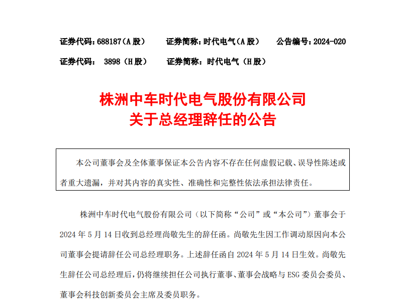 近日,A股上市公司時代電氣發(fā)布公告稱,其董事會已收到公司總經(jīng)理尚敬先生的辭任函。尚敬先生因工作調(diào)動需要,向董事會提請辭去公司總經(jīng)理職務(wù)。公告還顯示,尚敬辭任公司總經(jīng)理后,仍將繼續(xù)擔(dān)任公司執(zhí)行董事、董事會戰(zhàn)略與ESG委員會委員等職務(wù)。