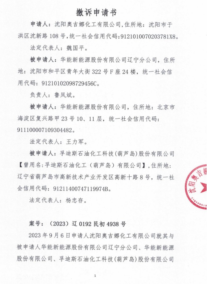 因法定代表人變更,且涉案當(dāng)事人已受到法律制裁,央企風(fēng)電招投標(biāo)招采違法串通申請(qǐng)行政處罰訴訟第一案,沈陽(yáng)奧吉娜化工有限公司撤訴!