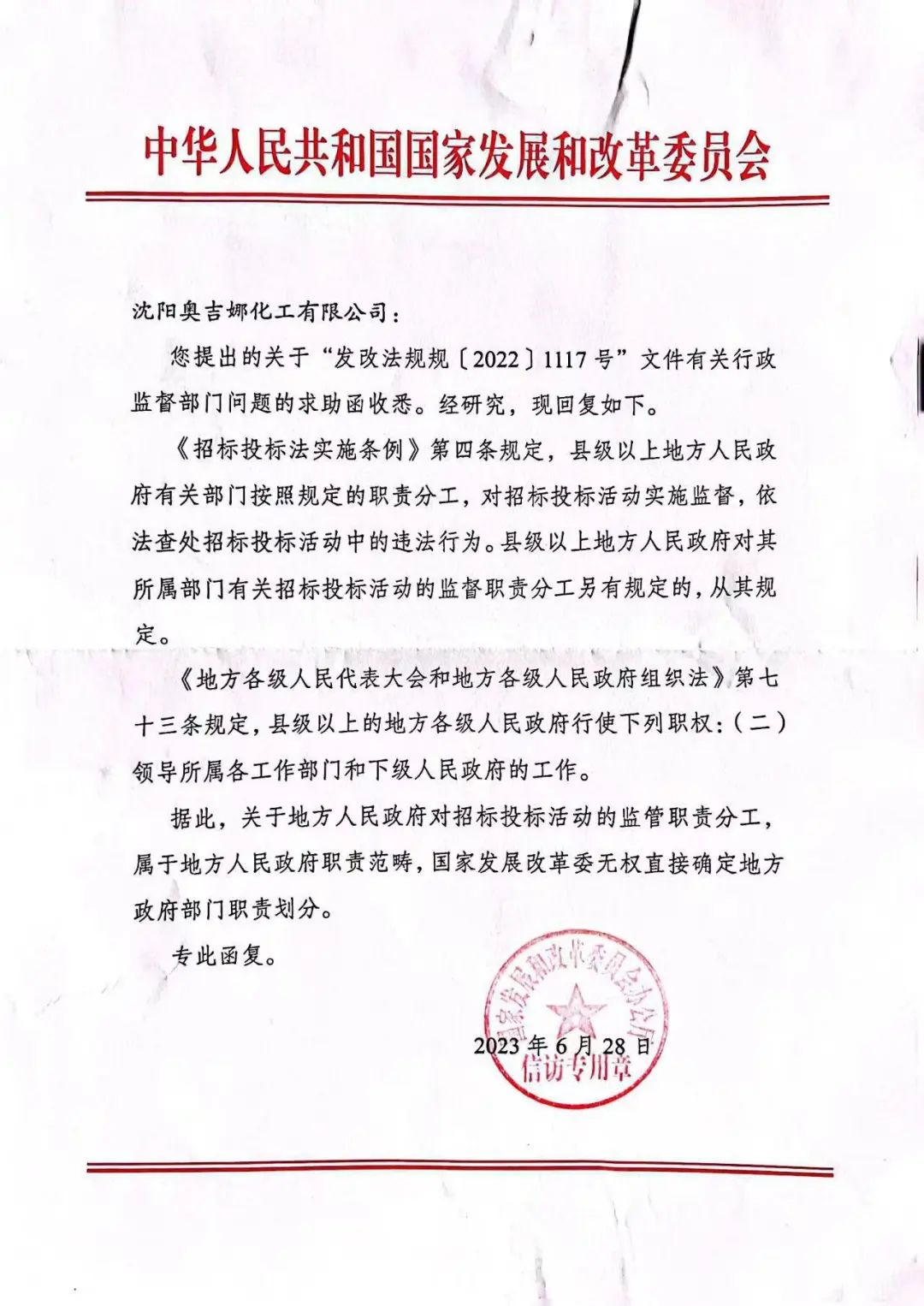 原告曾就被告一和被告三串通投標(biāo)赤裸裸的違法行為多方尋求監(jiān)督部門(mén)監(jiān)管,但一直求告無(wú)門(mén),無(wú)奈向國(guó)家發(fā)展和改革委員會(huì)投訴,經(jīng)國(guó)家發(fā)展和改革委員會(huì)回函“地方人民政府對(duì)招標(biāo)投標(biāo)活動(dòng)的監(jiān)管職責(zé)分工,屬于地方人民政府職責(zé)范疇,國(guó)家發(fā)展改革委無(wú)權(quán)直接確定地方政府部門(mén)職責(zé)劃分”(下附國(guó)家發(fā)改委回函)。