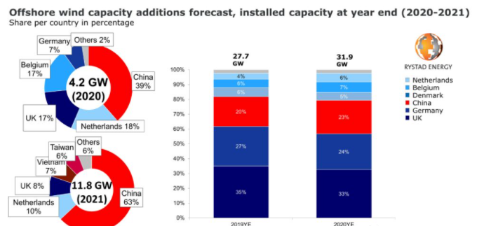 根據(jù)知名能源咨詢公司Rystad Energy數(shù)據(jù)統(tǒng)計(jì),盡管受新冠疫情影響,2020年全球海上風(fēng)電新增裝機(jī)4.2GW,同比增長(zhǎng)15%,總裝機(jī)達(dá)到31.9GW。同時(shí),該機(jī)構(gòu)預(yù)測(cè)今年全球?qū)⑿略鲅b機(jī)11.8GW,同比增長(zhǎng)37%,最終裝機(jī)達(dá)到43.7GW。