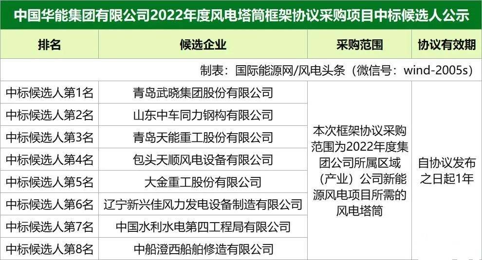 本網訊 近日,中國華能集團有限公司2022年度風電塔筒框架協(xié)議采購項目中標候選人公示。