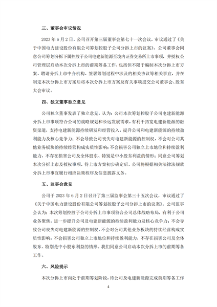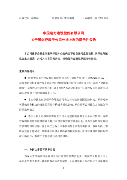 根據(jù)公告,擬拆分的中電建新能源集團(tuán)股份有限公司注冊(cè)資本為60億元,經(jīng)營范圍包括水電發(fā)電、風(fēng)力發(fā)電、太陽能發(fā)電、生物發(fā)電再生能源開發(fā)等。目前,電建新能源正在推進(jìn)引入戰(zhàn)略投資者相關(guān)工作。