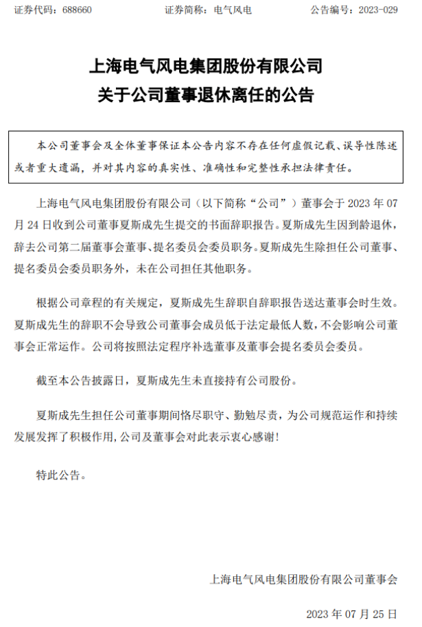 7月25日,上海電氣風(fēng)電集團股份有限公司(簡稱“電氣風(fēng)電”)發(fā)布《關(guān)于公司董事退休離任的公告》。