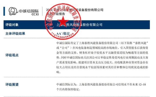 近日,上海泰勝風(fēng)能裝備股份有限公司(以下簡稱“泰勝風(fēng)能”)經(jīng)中誠信國際信用評級有限責(zé)任公司(以下簡稱“中誠信”)嚴格評審,被授予主體信用等級“AA+”,評級展望穩(wěn)定,成為風(fēng)電行業(yè)風(fēng)電支撐結(jié)構(gòu)第一家“AA+”企業(yè)。